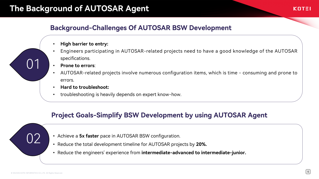 在汽车软件斥地中,芯片更换、新车型适配及主机厂定制需求当年需要高等工程师主导,但此类东谈主才商场供给有限。通过将高等工程师的时刻教养和行业常识图谱化,AUTOSAR大家Agent可扶持中级工程师完成复杂适配任务,格局初期便设定了斥地服从擢升5倍、斥地周期箝制20%的野心