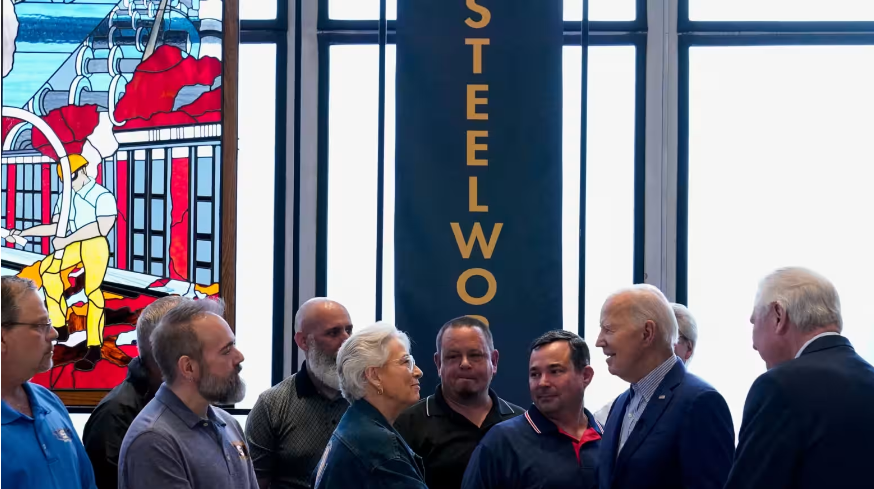 本年4月,好意思国总统拜登在匹兹堡会见好意思国钢铁工东谈主连合会工会成员 路透社